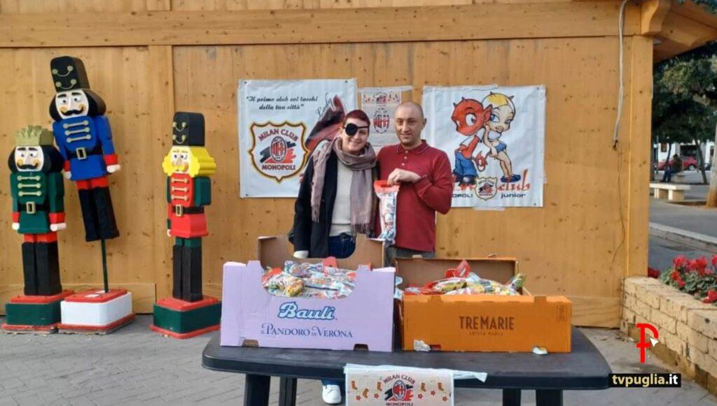 Il Milan club, in occasione dei festeggiamenti dell’Epifania, è scesa in piazza Vittorio Emanuele a Monopoli per effettuare una raccolta fondi benefica mediante la vendita di calze con i cioccolatini all’interno. Il Direttivo dell’associazione, presieduta da Giacomo Ferrarese, ha poi deciso di devolvere il ricavato per sostenere le spese mediche di Dory Colavitto, la donna rimasta vittima di un accoltellamento (ma che per fortuna è riuscita salvarsi) da parte del suo ex compagno nella mattina del 2 novembre scorso a Monopoli.
