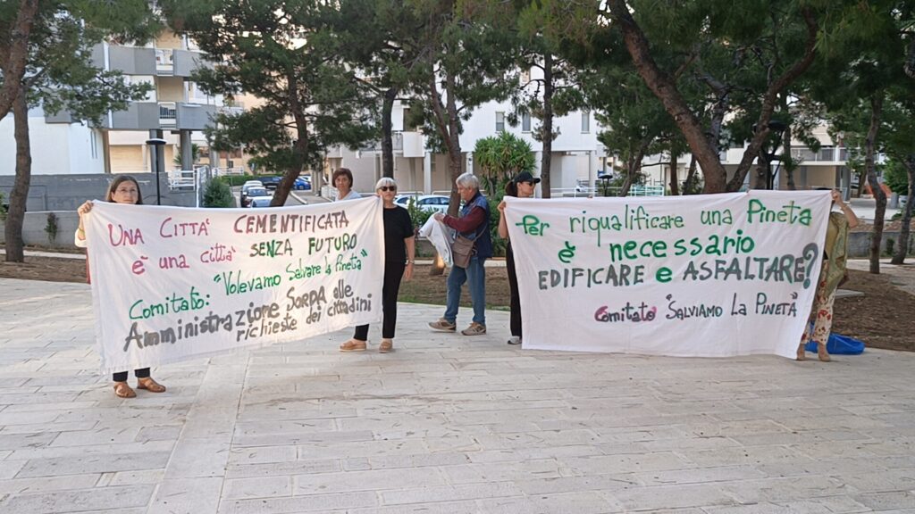 Inaugurata martedì sera la pineta di via Achille Grandi a Monopoli sottoposta a restyling di recente ma i lavori hanno comportato il sacrificio di una ventina di alberi di pino. In virtù di ciò, infatti, davanti a questo luogo insorsero alcuni cittadini e diedero vita ad un comitato di protesta nel quale si inserirono alcuni consiglieri comunali di opposizione.