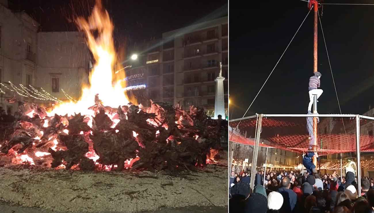 Ci si ritrova intorno alle fiamme che ardono, per chiacchiere, consumare qualcosa di caldo o per bere un buon bicchiere di vino ma non sono mancati nella cittadina del sud-est barese ulteriori motivi di intrattenimento come artisti di strada, bancarelle e soprattutto la novità dell’albero della cuccagna tornato in auge dopo decenni di inattività.