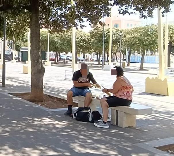 Una coppia di francesi mentre si prepara pane e pomodoro su una panchina di piazza V. Emanuele