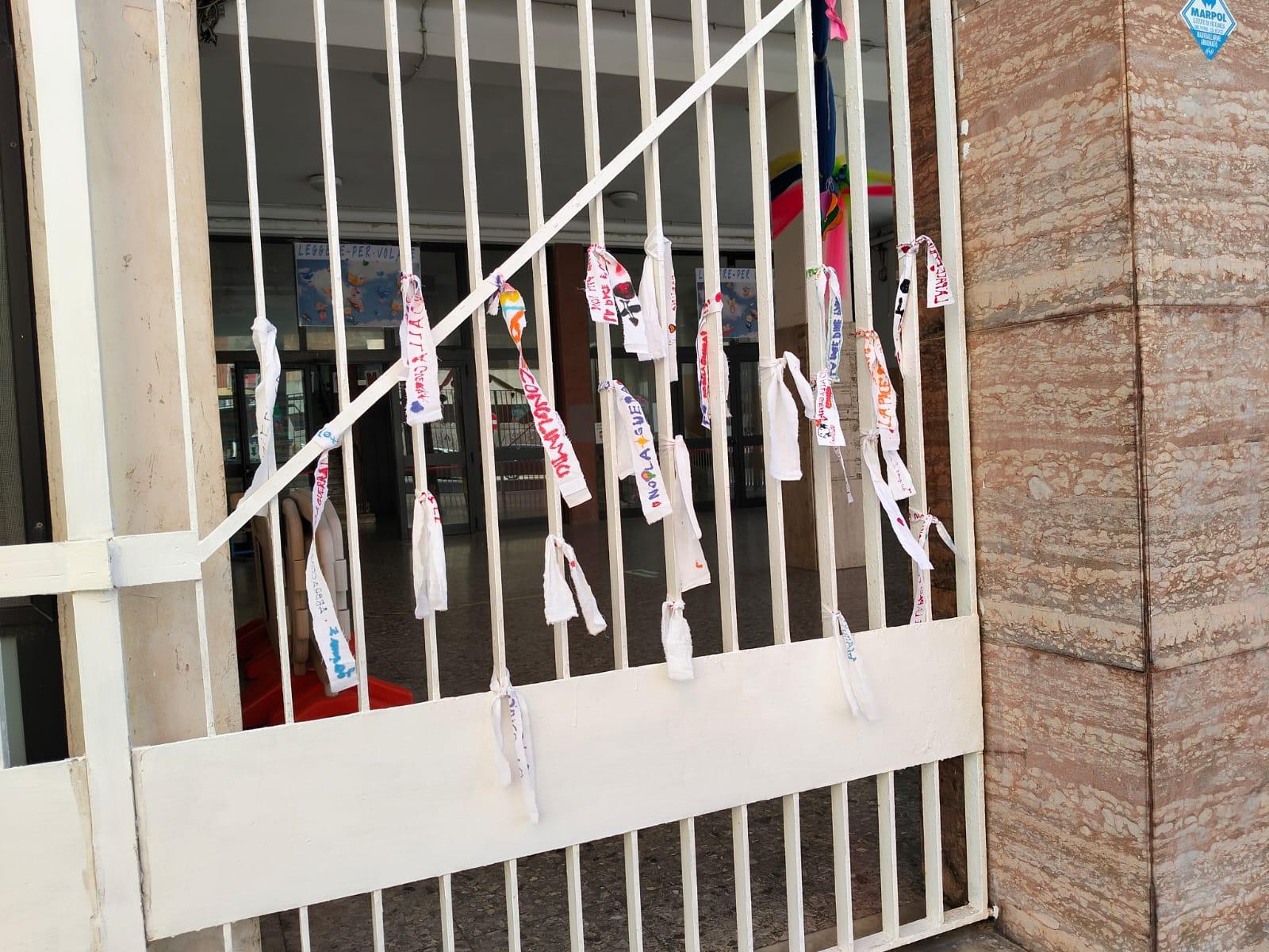 Monopoli, “straccetti di pace” bianchi per Gaza e Ucraina sui cancelli del 2^ I.C. Modugno-Galilei