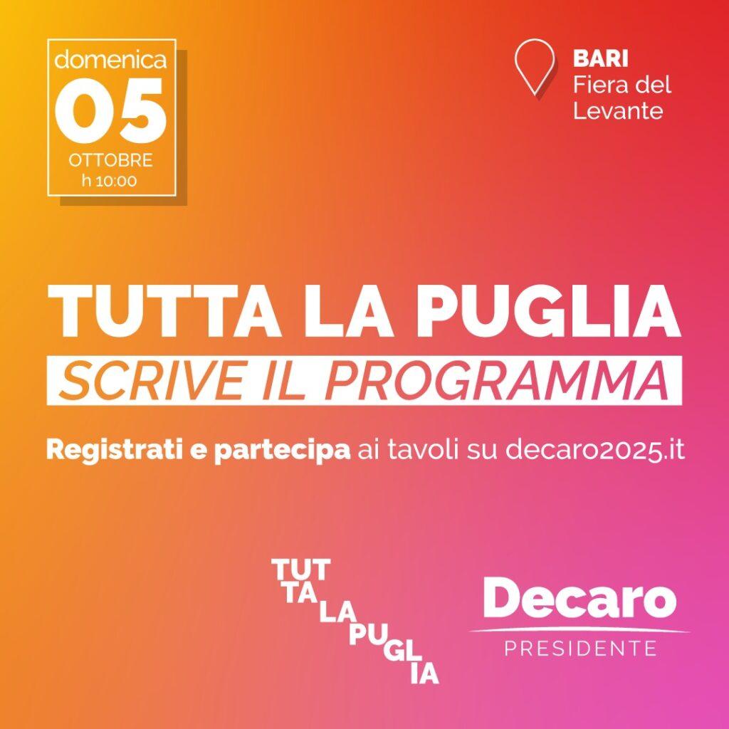 BARI – Sarà una domenica di partecipazione, idee e confronto quella che si prepara a vivere la Puglia domani, 5 ottobre, con l’evento “Tutta la Puglia scrive il programma”. Alla Fiera del Levante di Bari, dalle 10 alle 18, la coalizione progressista guidata da Antonio Decaro, candidato presidente per il centrosinistra, apre le porte al contributo di cittadini, esperti, associazioni e movimenti per costruire insieme il programma di governo regionale per i prossimi cinque anni.