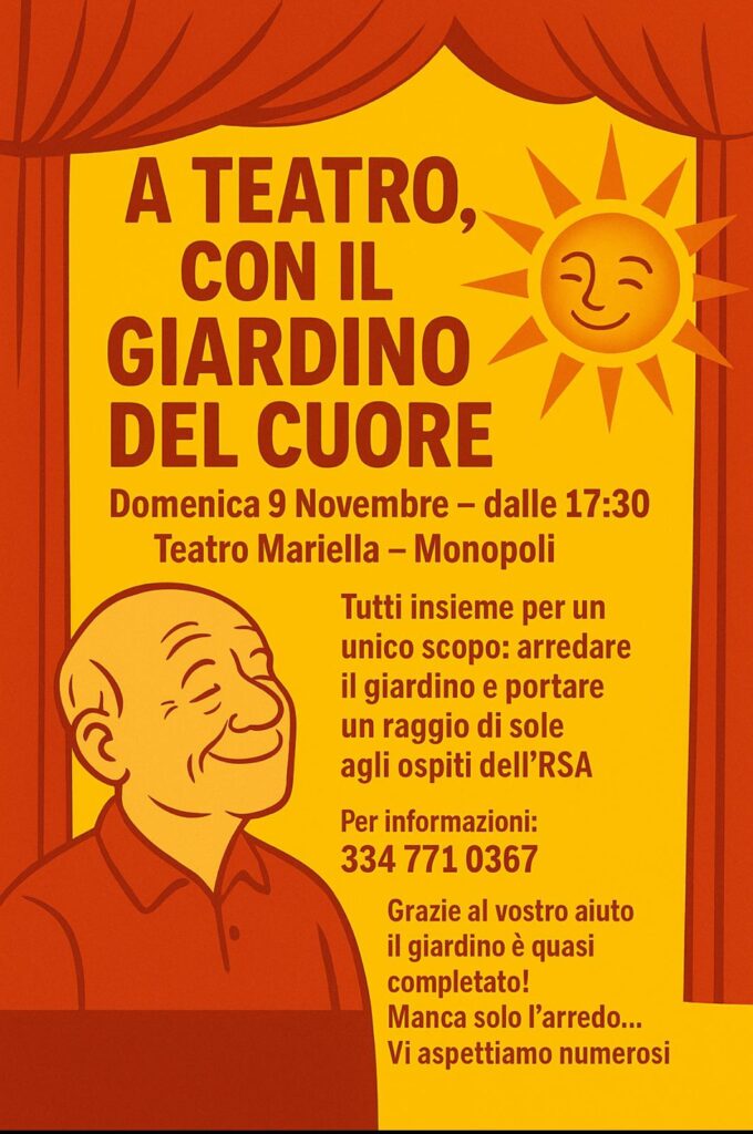 Una serata all’insegna della solidarietà e della cultura per donare agli anziani un luogo di serenità. Domenica 9 novembre alle ore 17:30, il Teatro Mariella di Monopoli ospiterà l’evento benefico “Un Giardino per i Nonni”, promosso da Marina Barletta e dedicato alla raccolta fondi per la realizzazione del “Giardino del Cuore”, un nuovo spazio verde che sorgerà davanti alla RSA Romanelli.